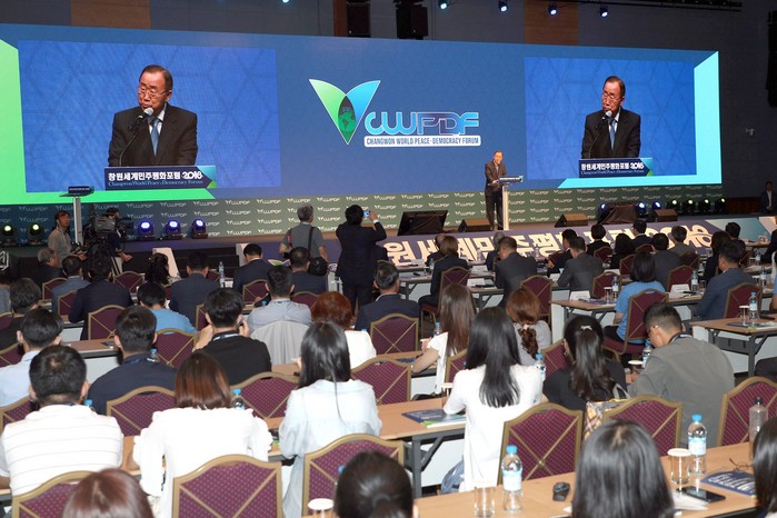 | ▲1일 오후 경남 창원시 의창구 창원컨벤션센터 컨벤션홀에서 열린 '창원세계민주평화포럼'에서 반기문 전 유엔 사무총장이 기조연설하고 있다.(창원시 제공) |