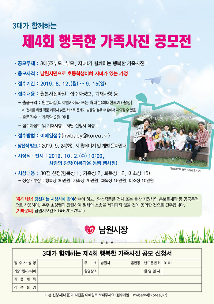 응모기간은 오는 9월 15일까지이며, 신청자격은 남원시민으로 초등학생이하 자녀가 있는 가정으로 조부모와 부모, 자녀가 함께 즐거웠던 순간을 담은 가족사진 원본과 함께 작품제목, 촬영장소, 촬영일, 간략한 사진 설명과 접수자 정보를 시 보건소 이메일(nwbaby@korea.kr)로 접수하면 된다.