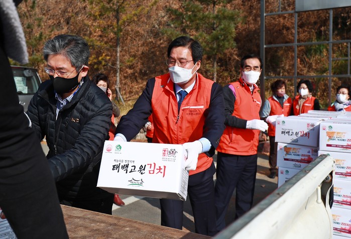 ▲류태호 시장이 2020 김장지원사업 전달식에 참여하고 있다.(태백시 제공) |