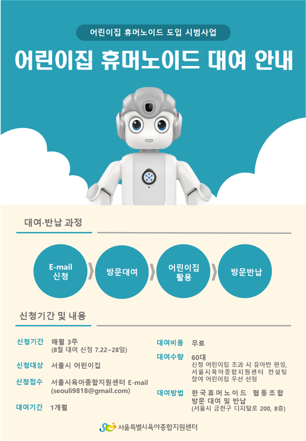 인공지능 로봇을 활용하고자 하는 어린이집은 별도의 자격요건 없이 서울시 육아종합지원센터에 이메일로 신청하면 된다. 대여 비용은 무료며, 대여기간은 1개월이다.
