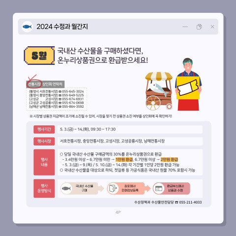 행사 기간 당일 구매한 국내산 수산물의 카드영수증 또는 현금영수증을 해당 전통·수산시장 행사 부스로 가져가면 환급받을 수 있다.