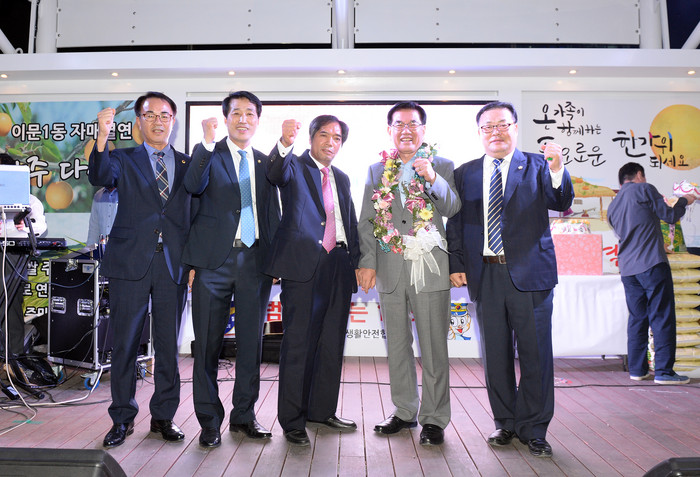 ▲광장에 조성된 공연무대에서 기념촬영하는 유덕열 동대문구청장.(오른쪽 두 번째) |