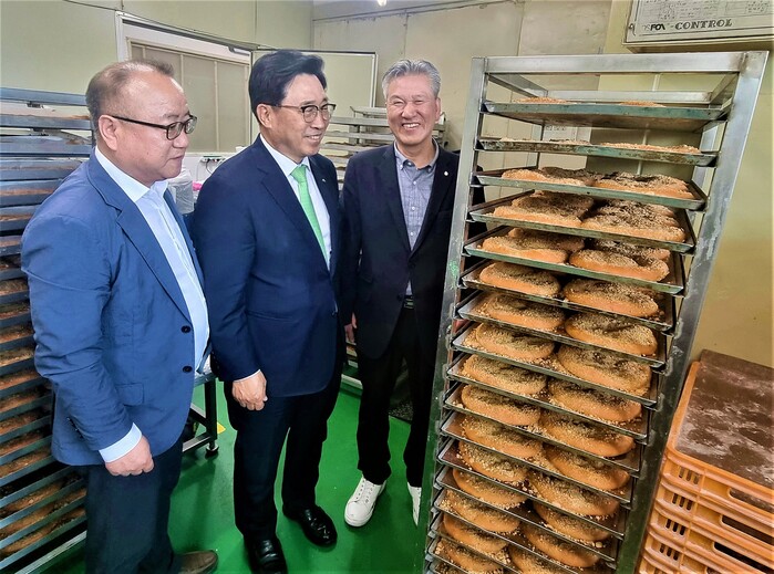 ▲ 까레몽제빵소 방문 현장 사진. 한국농수산식품유통공사 김춘진 사장(가운데), 까레몽제빵소 김봉수 대표(우측1번째) |
