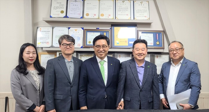 ▲ 농업회사법인 고원김치(주) 방문 현장 사진. 한국농수산식품유통공사 김춘진 사장(좌측3번째), 농업회사법인 고원김치(주) 임병석 대표(우측2번째) /aT 제공 |