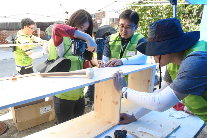 공사 직원봉사단 26명은 아동센터에 직접 방문, 아이들의 쾌적한 환경 조성을 위해 내부 도배 작업과 식탁, 수납장, 공간박스 등의 DIY 가구들을 만들었다.