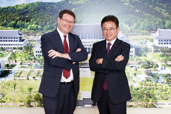 ▲놀란 바크하우스(Nolan Barkhouse · 왼쪽) 주부산 미국영사가 10일 경북도청을 방문해 이철우 경북도지사(오른쪽)를 예방했다. <사진=경북도 제공> |