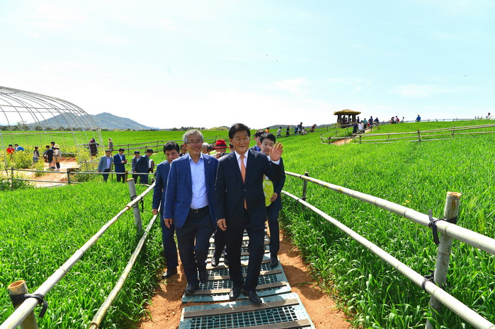 ▲올해로 15회를 맞은 봄철 대표 축제인 ‘고창 청보리밭축제’가 화려하게 개막했다. 박우정 고창군수가 25만평 광활한 대지의 청보리와 유채꽃이 활짝핀 축제장을 둘러보고 있다. |