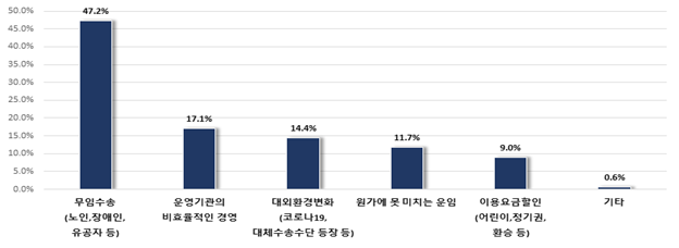 도시철도 운영기관의 재정을 악화시키는 주요 원인에 대해서는 무임승차 제도라 답변한 응답자 비율이 47.2%로 가장 높았다.