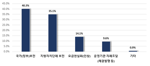 지하철 노후시설 개선에 필요한 막대한 재원을 운영기관이 어떻게 확보해야 하는지에 대한 설문조사에서는 국가가 비용을 보전해야 한다고 응답한 비율이 40.3%로 가장 높았다. 지자체 보전, 요금 현실화(인상), 운영기관 자체 조달이 그 뒤를 이었다. 현 체제인 운영기관 자체 조달 방식이 바람직하다고 응답한 사람은 9.6%에 불과했다.