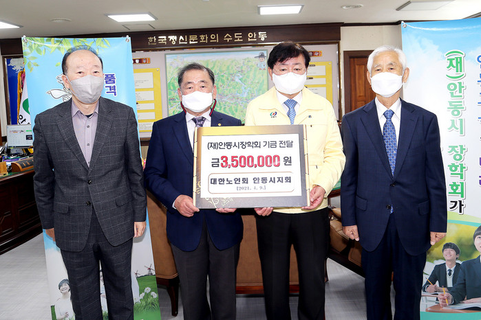 지난 4월 8일 대한노인회안동시지회(회장 김동량)는 안동시장학회에 350만원의 성금을 전달해 누적 기부액은 3653만원에 달했다. 관내 523개소 경로당의 나눔 실천 운동을 통해 모금한 성금을 11회에 걸쳐 기탁하며 지역의 우수한 인재들에게 꿈과 희망을 전해주고 있다.