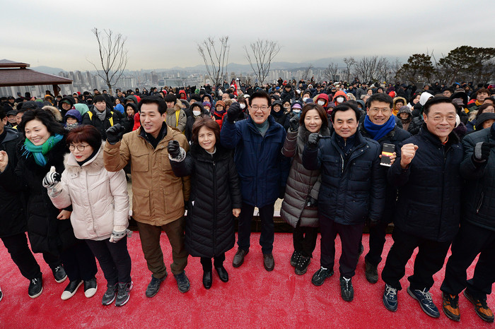 ▲2020년 1월 1일(수) 아침, 배봉산 정상부 근린공원에서 열린 ‘2020 배봉산 해맞이 행사’에 참석한 유덕열 동대문구청장 내외 및 내빈들이 주민들과 함께 “경자년 파이팅!”을 외치고 있다.(동대문구 제공) |