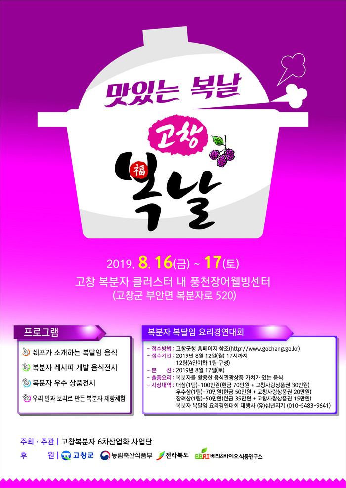 이번 고창복날 행사는 고창 복분자를 소재로, 고창만의 복날음식을 개발·보급해 특색 있는 음식문화를 만들어 가기 위해 마련됐다.