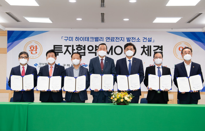 [로컬세계 이창재 기자]경북도와 구미시는 6일 구미시청 회의실에서 하대성 경제부지사, 장세용 구미시장, 강승곤 ㈜브이티지엠피 대표이사, 김학봉 KJ그린에너지㈜ 사장, 송재섭 한국서부발전(주) 부사장, 정상기 미래에셋 에너지 인프라자산운용 대표이사 부회장, SK에코플랜트 이왕재 수소사업추진단장, 지역 도의원 및 시의원 등이 참석해 하이테크밸리 산업단지 내 수소연료전지 발전단지를 조성하는 투자양해각서를 체결했다.