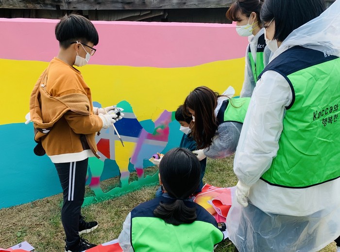 ▲14(수) 콘진원 임직원들이 나주시에 위치한 아동양육시설 금성원 내 산책로 유휴 벽면에 '함께 그리는 산책길'을 주제로 아동들과 함께 벽화그리기 작업을 진행하고 있다.(콘진원 제공) |