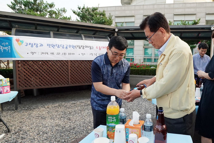 ▲유덕열 구청장이 22일 저녁 구청 소담뜰에서 직원들과 함께하는 ‘치맥’ 소통간담회를 열었다.(동대문구 제공) |