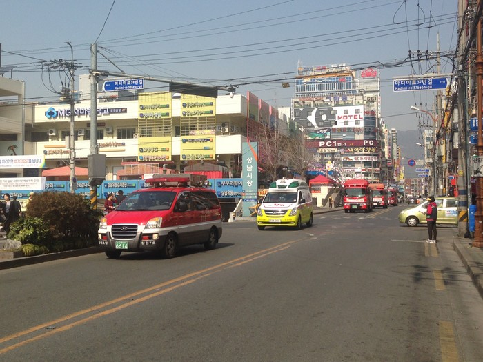 | ▲상남시장 앞길에서 소방차 길터주기 훈련을 실시하고 있다.(창원시 제공) |