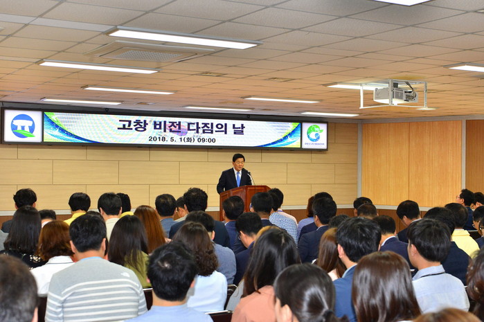 박 군수는 군청 대회의실에서 열린 ‘비전다짐의 날’ 행사에서 "지난 3년 10개월 군정을 이끌며 변화와 혁신으로 외형보다 내실 있는 발전을 기했다"며 "공직자 모두가 한 마음으로 함께해 주어 명실상부한 ‘한국인의 본향, 아름답고 청정한 명품 고창군’으로 완성도를 높이고 거듭 발전했다"고 말했다.