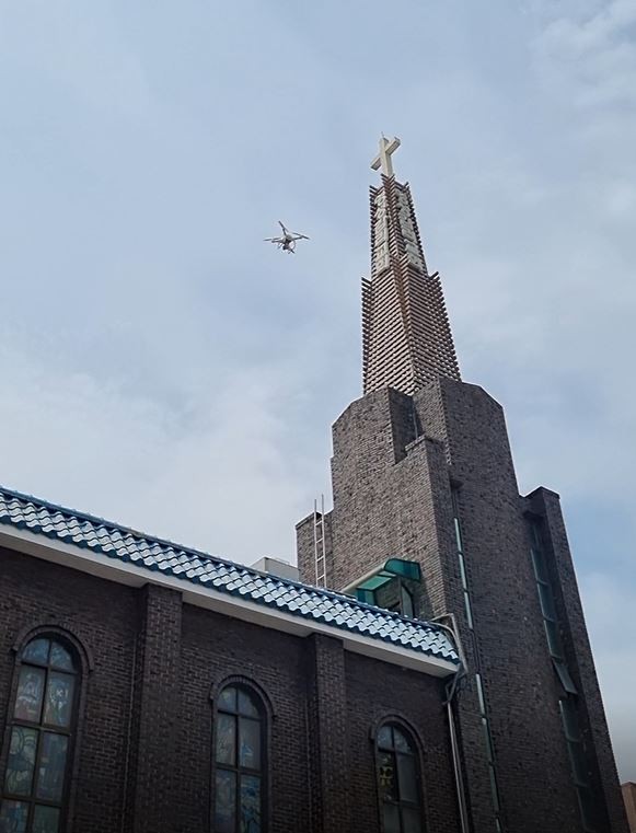 ▲동대문구는 첨단 드론을 활용해 접근이 어려운 취약시설물(첨탑, 급경사지 등)을 점검한다. |