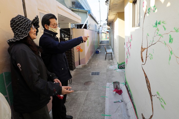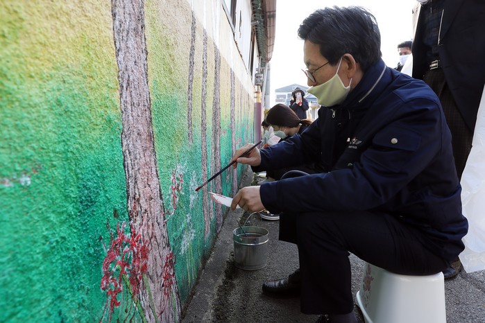 특히 지난 9일 오후에는 유기상 군수와 성산마을 주민이 함께 벽화 그리기에 동참했다. 지역에 대한 자긍심 고취는 물론 주민에게 더욱 사랑받는 벽화골목이 될 것으로 기대를 모으고 있다.