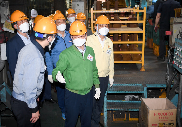 ▲ 이철우 경북도지사가 도내 한 산업체 현장을 방문해 임직원들을 격려하고 있다. 경북도청 제공 |