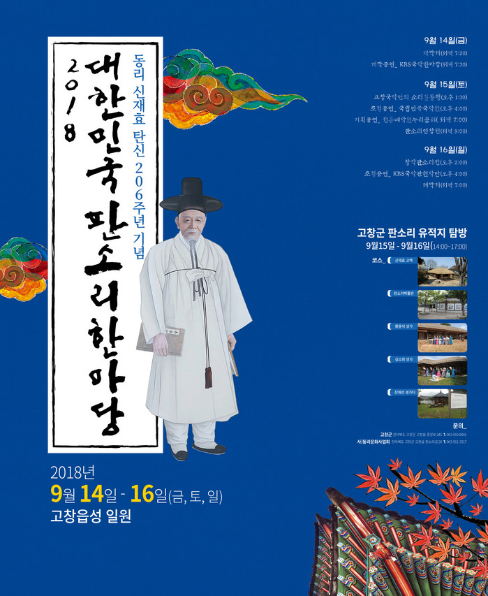 이번 동리 신재효 탄신 206주년 기념 ‘2018 대한민국 판소리 한마당’은 고창군과 (사)동리문화사업회가 함께 마련했다. 관람료는 무료이며 야외행사는 우천 시 고창문화의전당에서 진행한다.