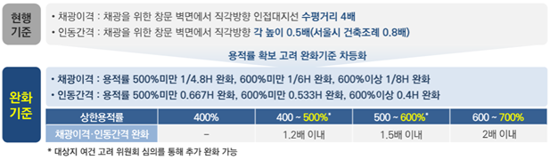 현재 채광이격 및 인동간격에 따른 건축물 높이제한이 있어 용적률 500% 이상의 고층고밀주거의 조성이 여의치 않아 본 수립기준은 상한용적률의 범위와 연동해 이를 완화할 수 있도록 했다.