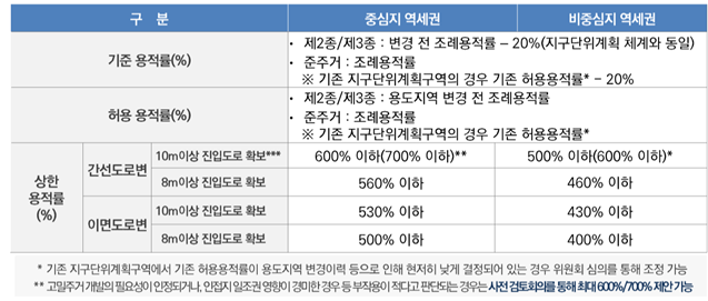 용적률체계는 현행 ‘공동주택 건립형 지구단위계획 수립기준’과 정합성을 유지하되, 상한용적률은 도시계획 측면의 중심지체계, 대중교통의 접근성을 고려한 대상지 입지, 진‧출입도로 폭원 등을 고려해 차등 적용할 예정이다.