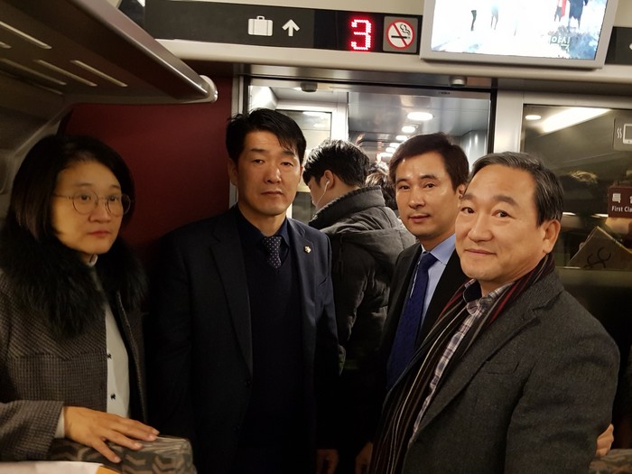 | ▲SRT를 탑승해 수서역으로 향하고 있는 신미숙 시의원(왼쪽부터), 배정수 시의원, 서철모 화성시장, 원유민 시의원 |