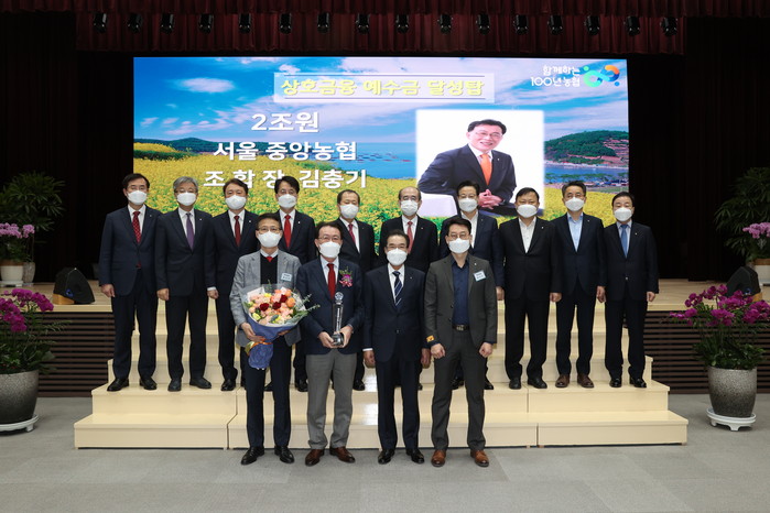농협중앙회(회장 이성희)는 3일 개최된 정례조회에서 사업추진 우수 농축협에 대한 시상식을 가졌다. 이날 시상식에서 서울 중앙농협(조합장 김충기)이 상호금융 예수금 2조원 달성탑을 수상했다.