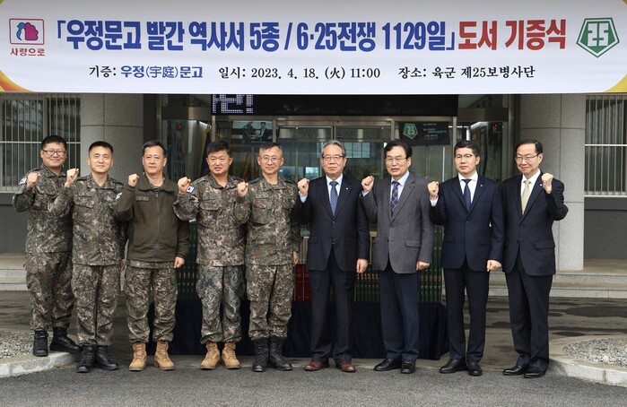 부영그룹은 18일(화) 육군 25사단에 ‘6・25전쟁 1129일’ 및 역사서 5종 130세트를 기증했다. 이날 행사에는 부영그룹 창업주 이중근 회장을 대신해 최양환 대표이사와 최성진 육군 25사단 사단장 및 관계자들이 참석했다.