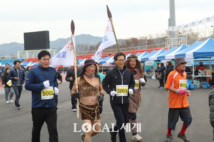 [로컬세계 김경락 기자]18일 고창공설운동장 일원에서 열린 제16회 고창 고인돌 마라톤대회에서 유기상 군수(왼쪽에서 세번째)와 조규철 군의회 의장(왼쪽에서 첫번째)이 원시인 복장을 한 마라톤 동호인들과 함께 달리고 있다.