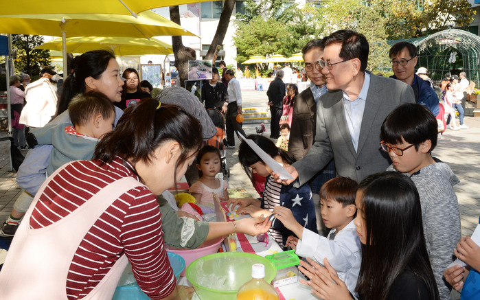 ▲21일 동대문구청 앞 광장에서 개최된 동대문구 협치한마당 행사에서 유덕열 동대문 구청장이 아이들 체험 부스 운영자의 설명을 듣고 있다. |