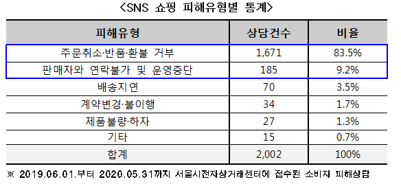 서울시 전자상거래센터는 지난해 6월부터 올해 5월말까지 최근 1년 사이 접수된 'SNS쇼핑 피해현황'과 일반 소비자 4000명을 대상으로 한 'SNS이용실태조사'결과를 함께 발표했다.