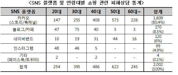 피해신고가 가장 많았던 SNS플랫폼은 ‘카카오(스토리/톡채널)’로 80.4%였다. 다음이 블로그/카페, 네이버 밴드, 인스타그램 순이었다. 20대 소비자는 타 연령에 비해 인스타그램 피해비율이 상대적으로 높았고, 40~50대는 카카오 피해가 거의 대부분이었다.