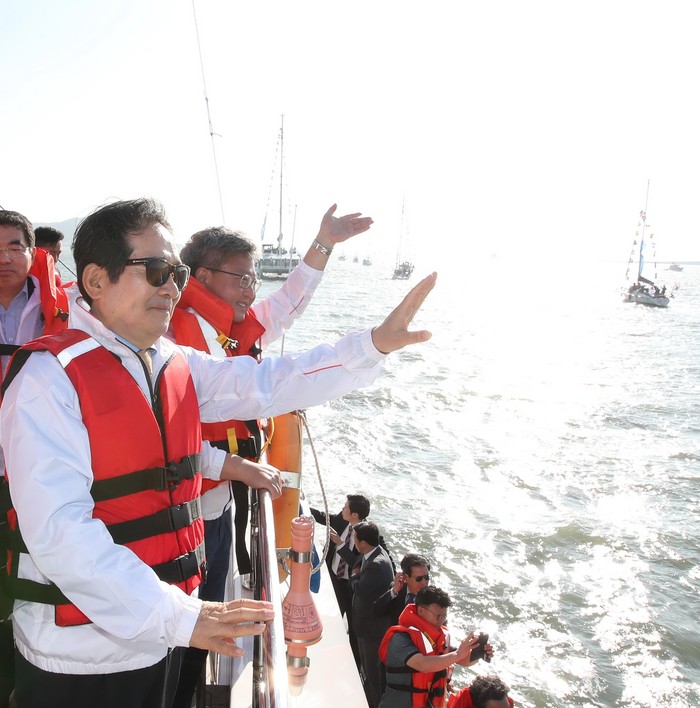 | ▲화성뱃놀이축제에서 승선체험을 하는 정세균 국회의장과 채인석 화성시장 |