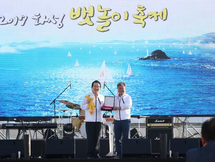 | ▲ 화성뱃놀이축제 개막식에서 화성시명예시민으로 선정된 정세균 국회의장.(사진제공: 화성시청) |