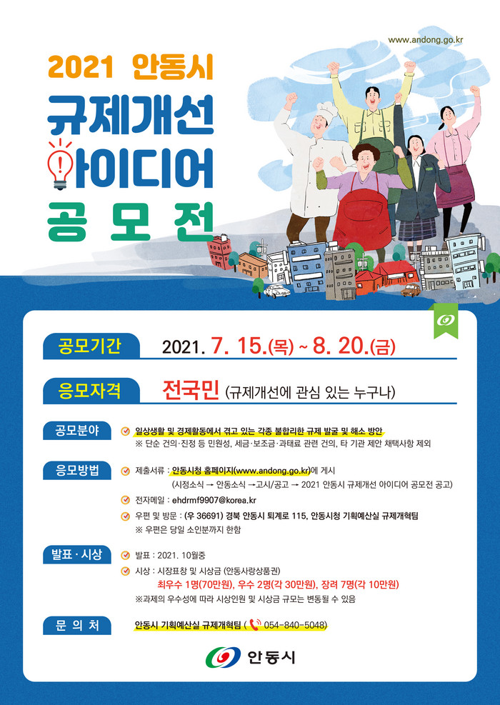 [로컬세계 이창재 기자]경북 안동시는 시민생활과 경제활동에서 불편을 초래하는 규제를 적극적으로 발굴·개선하기 위해‘2021 안동시 규제개선 아이디어 공모전’을 개최한다.
