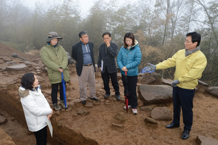 ▲교룡산성 군기터 발굴조사 현지보고회를 가졌다.(오른쪽 이환주 남원시장) |