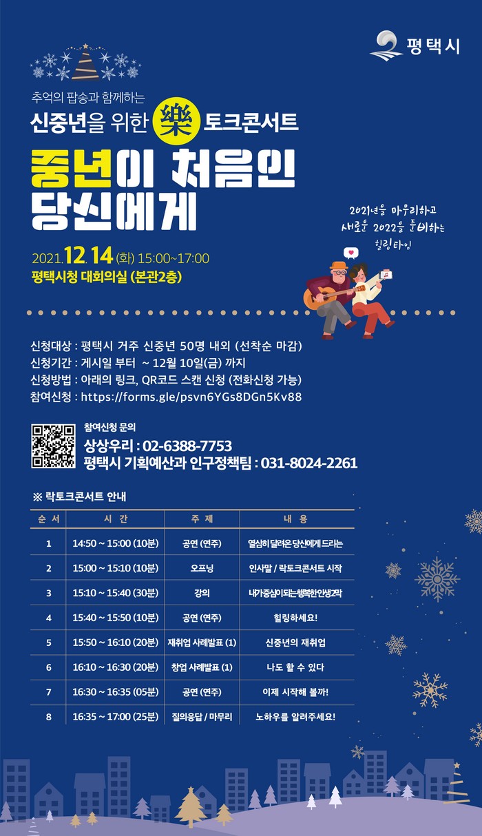[로컬세계 김병민 기자]경기 평택시(시장 정장선)는 신중년의 인생이모작 동기부여를 위해 다음달 14일 평택시청 대회의실에서 樂토크콘서트 '중년이 처음인 당신에게'를 개최한다고 25일 밝혔다.