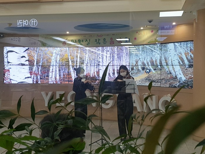이날 공연은 군이 코로나19로 힘들고 우울감을 느끼는 군민들과 직원들을 위해 기획한 것으로 지역 음악가 박춘선씨와 그의 제자 김가영씨의 재능기부로 진행됐다.