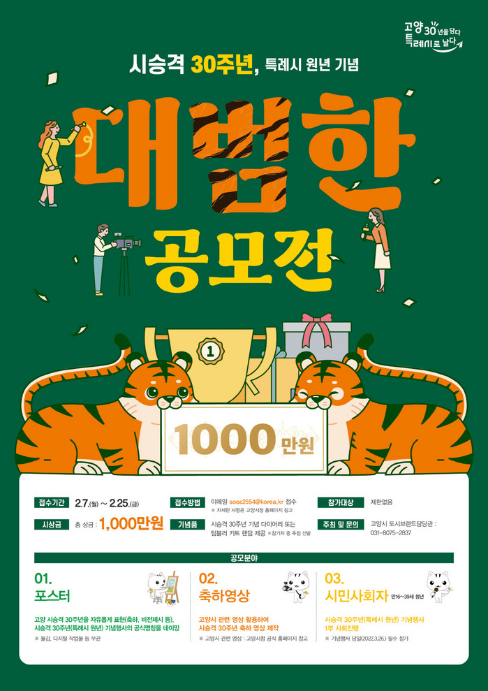 공모 주제는 고양시 시승격 30주년과 고양특례시 출범 원년을 기념하기 위한 포스터, 축하영상, 시민사회자 등 세 개 분야다.
