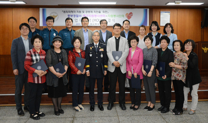 [로컬세계 맹화찬 기자]부산중부경찰서는 8일 오후 경찰서 4층 강당에서 부산중구자원봉사센터 및 소속 6개 자원봉사단체와 범죄피해자 지원을 위한 업무협약(MOU)을 체결했다.