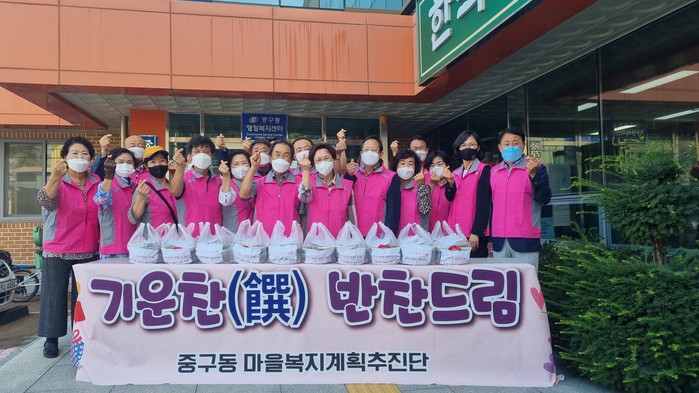 이번 사업은 중구동 마을복지계획 수립에 따른 활동으로서 ‘서로가 있어 행복한 참 이웃 중구동’이라는 비전 아래 어르신 정서 및 일상생활 지원이라는 의제에 맞추어 관내 스스로 식사를 해결하기 어려운 저소득 20세대를 선정하여 월 2회 밑반찬을 지원한다.