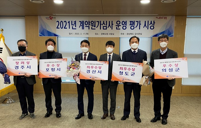 [로컬세계 이창재 기자]경북도는 17일 도청에서 ‘2021년 계약원가심사 운영 평가’에서 우수한 성적을 거둔 6개 시.군과 업무 추진 유공 공무원에 대한 시상식을 가졌다고 밝혔다.