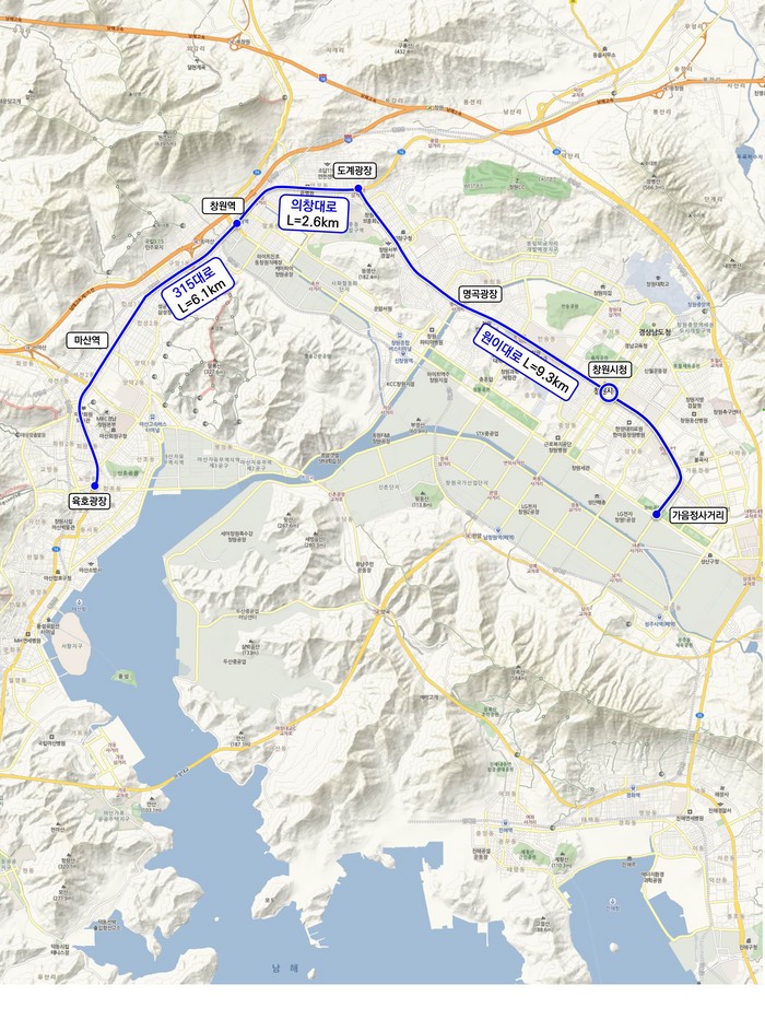 마산육호광장~창원역~시청~가음정사거리 총 18km 구간