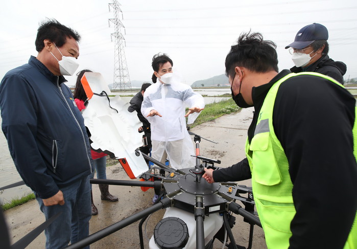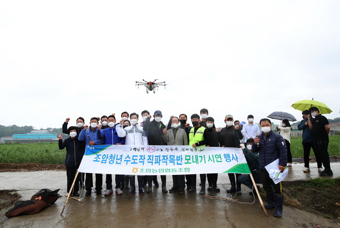 이번 모내기는 무인 멀티콥터로 볍씨 종자를 탑재하고 물논에 뿌리는 드론 파종 직파재배 시연과 함께 이양기를 활용한 전통 모내기가 이뤄졌다.