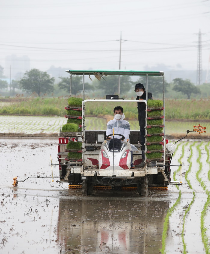 | ▲서철모 화성시장이 21일 장안면 독정리 일원 쌀 재배단지에서 이양기 시연(모내기)을 하고 있다. 화성시 제공 |
