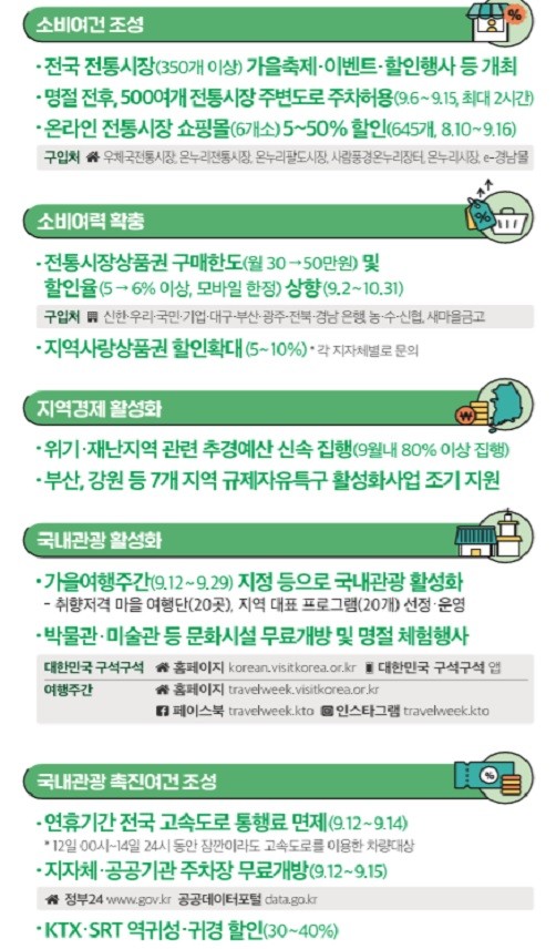 추석 명절 기간 소비를 촉진하기 위해 직거래 장터와 특판장 등을 2700여개소 개설하고 관련 상품을 5∼50% 저렴한 가격에 판매하는 추석맞이 할인 행사를 한다.