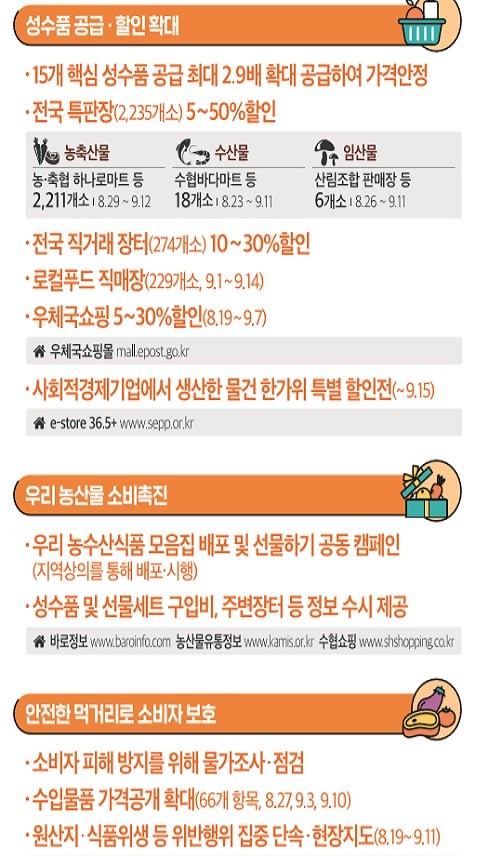 전국 2235개 특판장에서는 제수용품, 과일·한우 선물세트를 10~50% 할인 판매하고, 산림조합 임산물도 10~15% 저렴하게 살 수 있다. 244개 직거래장터에서는 농축산물을 10~30% 싸게 판매하고, 229개 로컬푸드 마켓에서도 성수품과 지역별 농산물을 할인 판매한다. 우체국쇼핑은 인터넷을 통해 추석 선물 대전 행사를 열어 특산물 3400여개, 생필품 1000여개 품목을 5~30% 할인한다. 17개 농협·한우협회는 이동판매를 통해 한우와 돼지고기를 20% 할인 판매한다.
