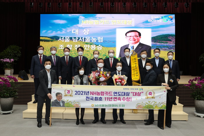 농협중앙회(회장 이성희)는 3일 개최된 정례조회에서 '2021 NH농협카드 연도대상'을 시상했으며, 남서울농협(조합장 안용승)이 농축협 7대도시 부문 대상을 수상해 트로피와 축하 꽃다발을 받았다.